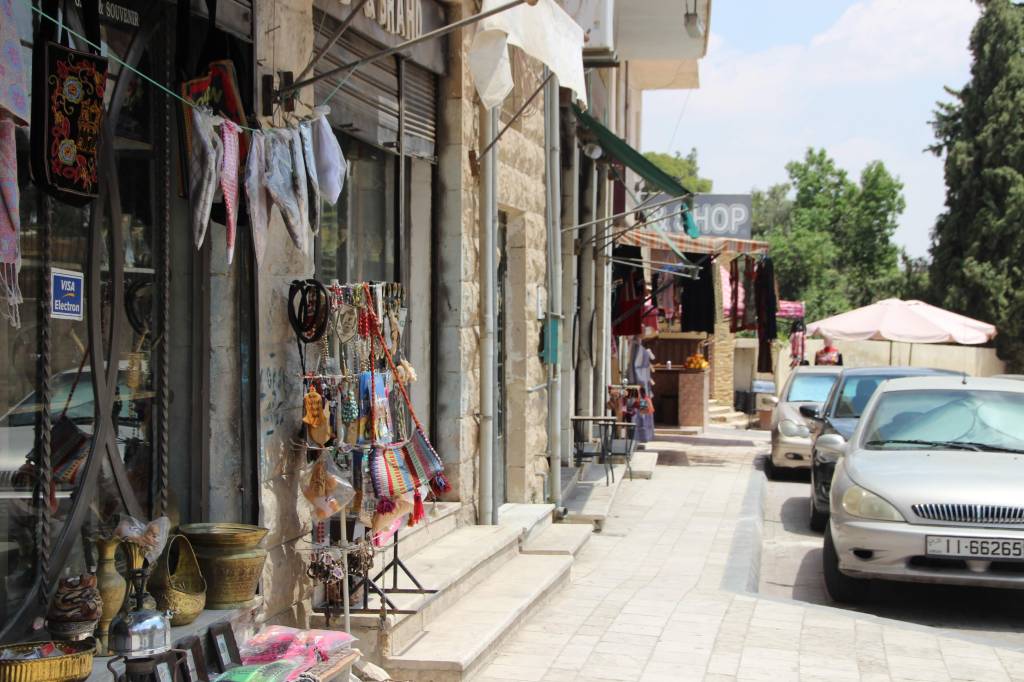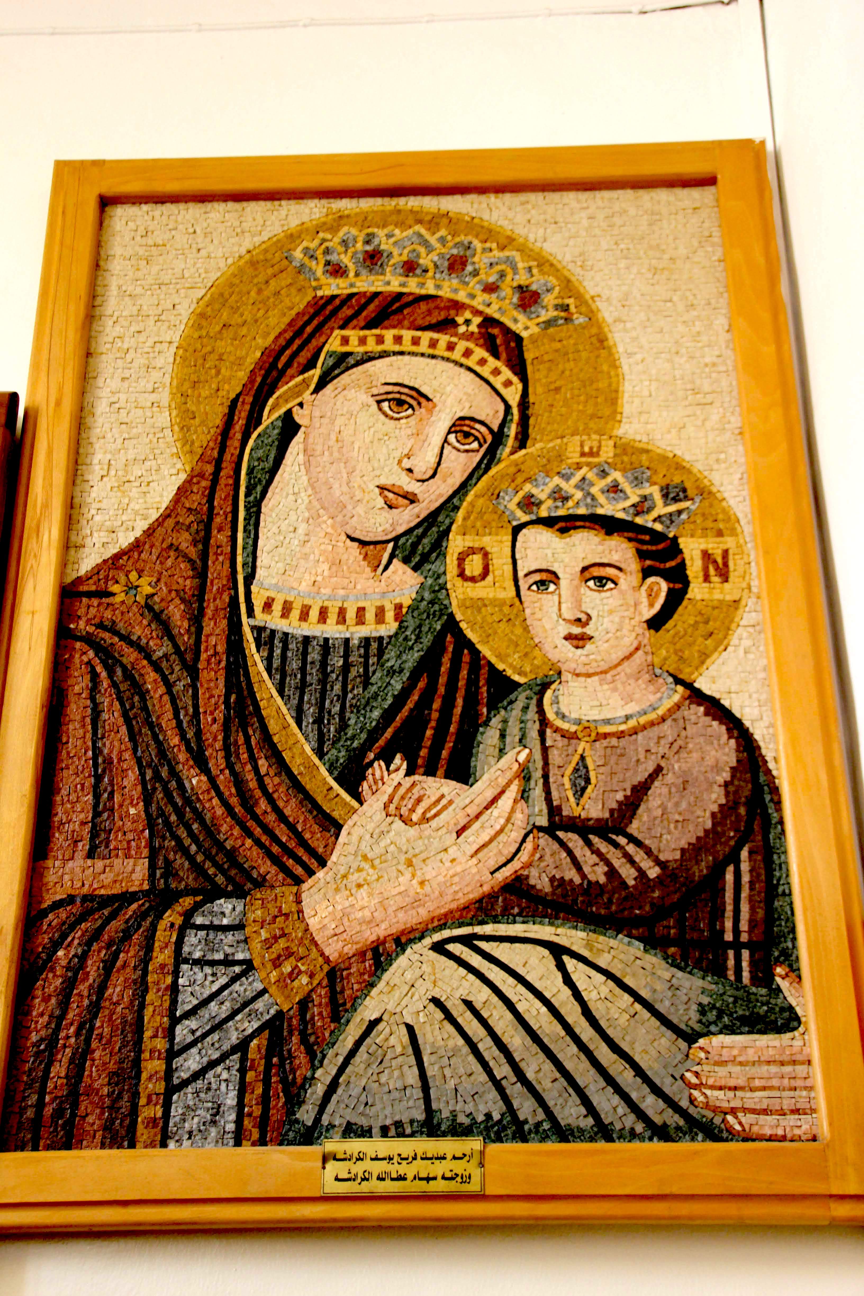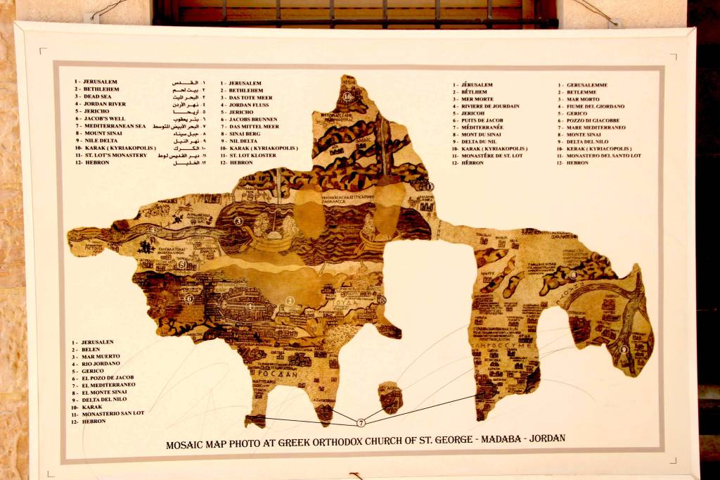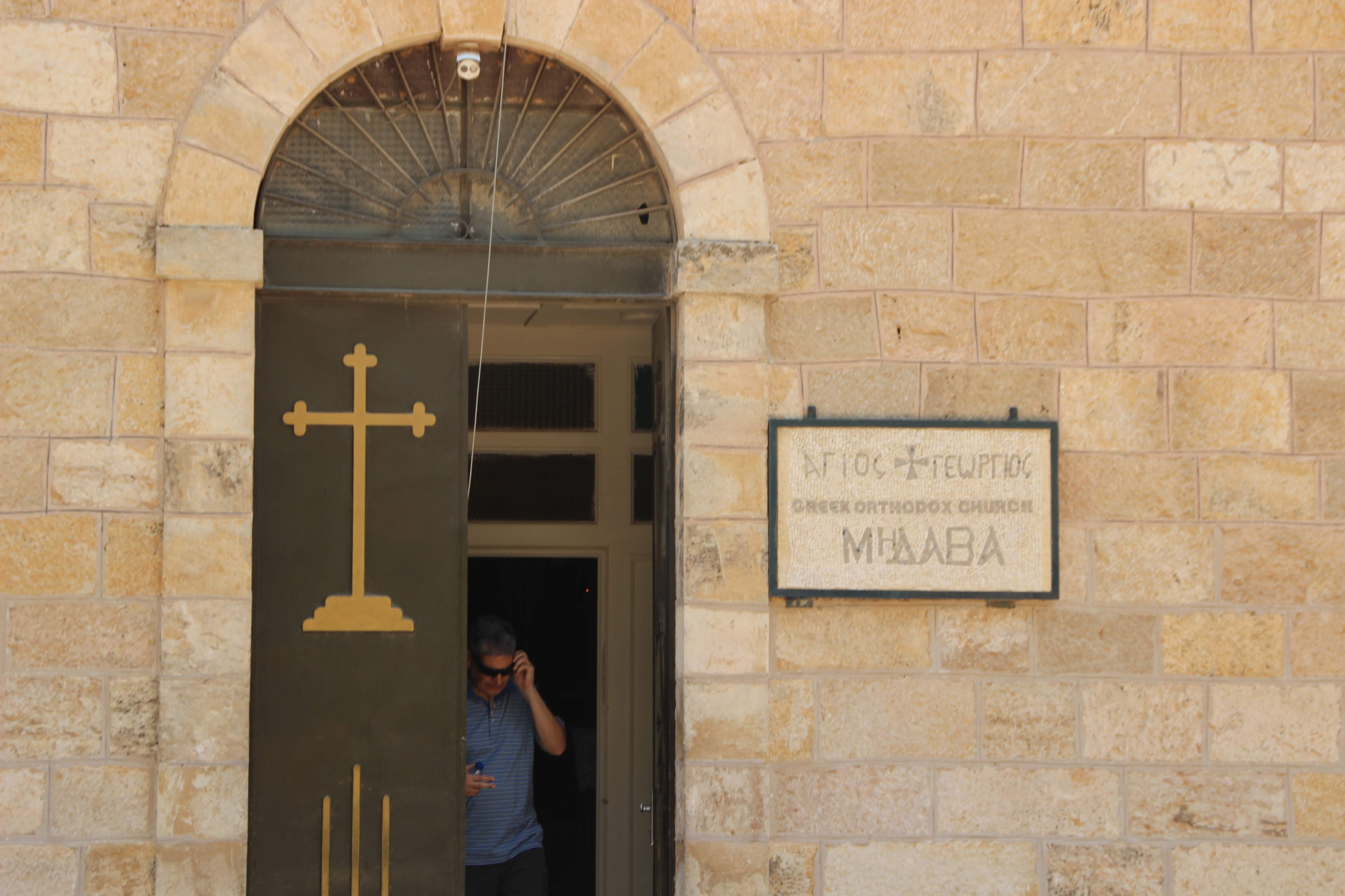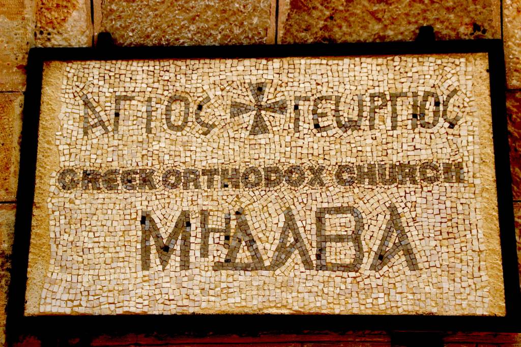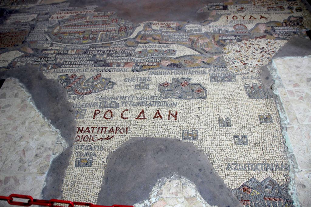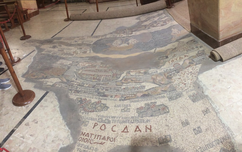 We continued driving, past pockets of houses, people living in tents, shepherd with their flock of goats or sheep, and an amazing amount of rubbish. It is so incredibly dry and hot, and I wondered how people make a living with their flocks. I give them credit and respect for surviving in such harsh conditions. Finally into Madaba, I noticed the buildings were rough, dirty and in different states of brokenness. So much trash littered the sides of the road, yet there were shops with ball gowns and lovely woven mats and fabrics. In Old Testament times, Madaba was a Moabite city, that the Israelites conquered, today it is a Christian town, and the 5th largest in Jordan.