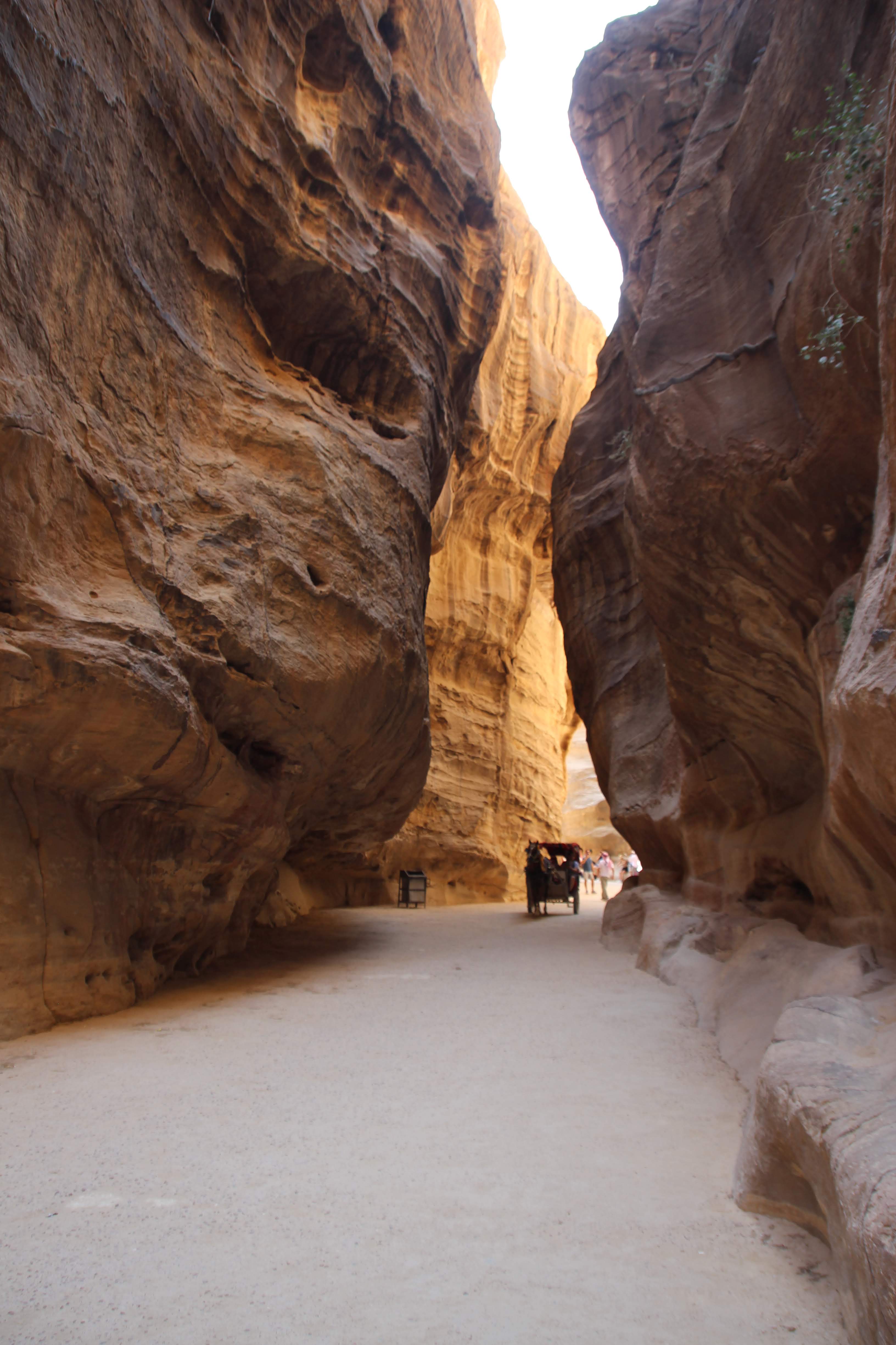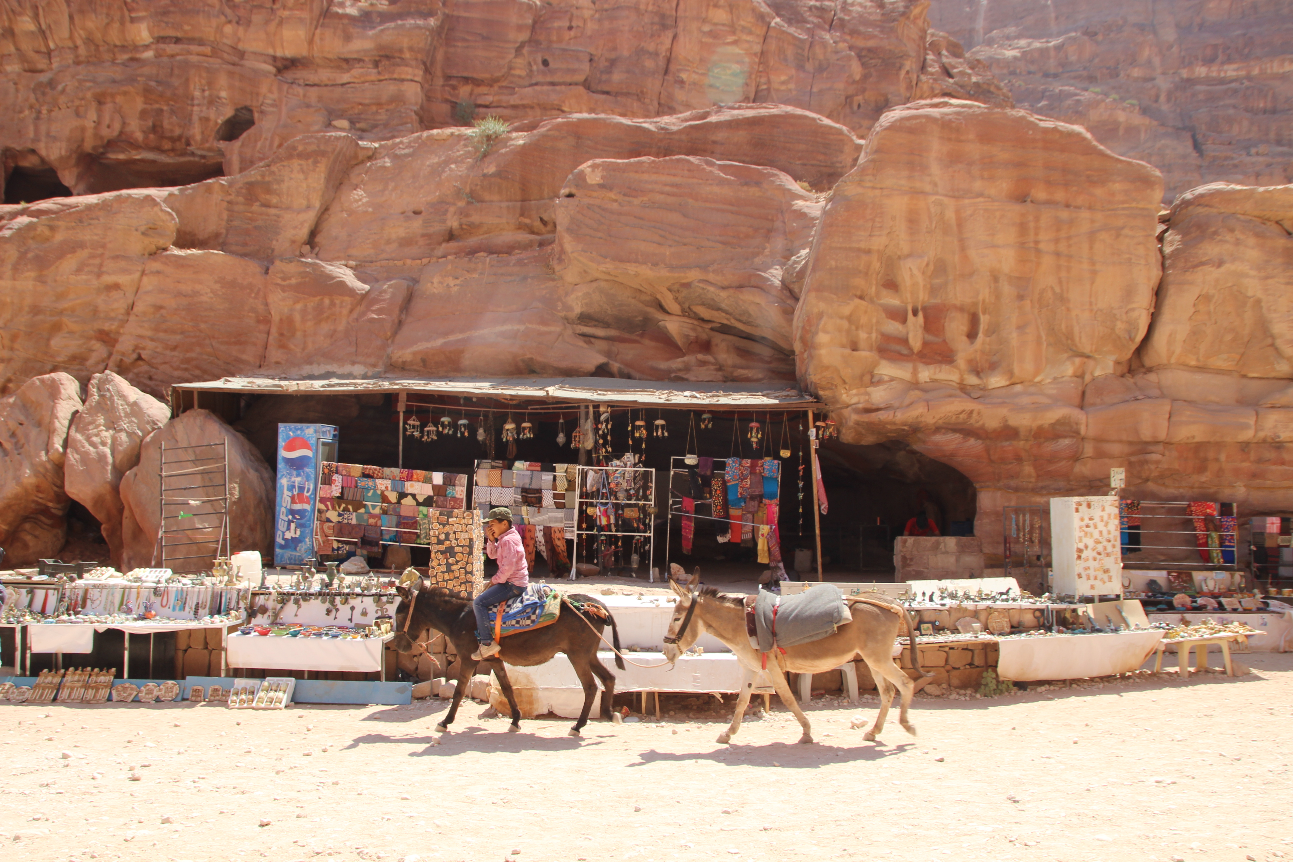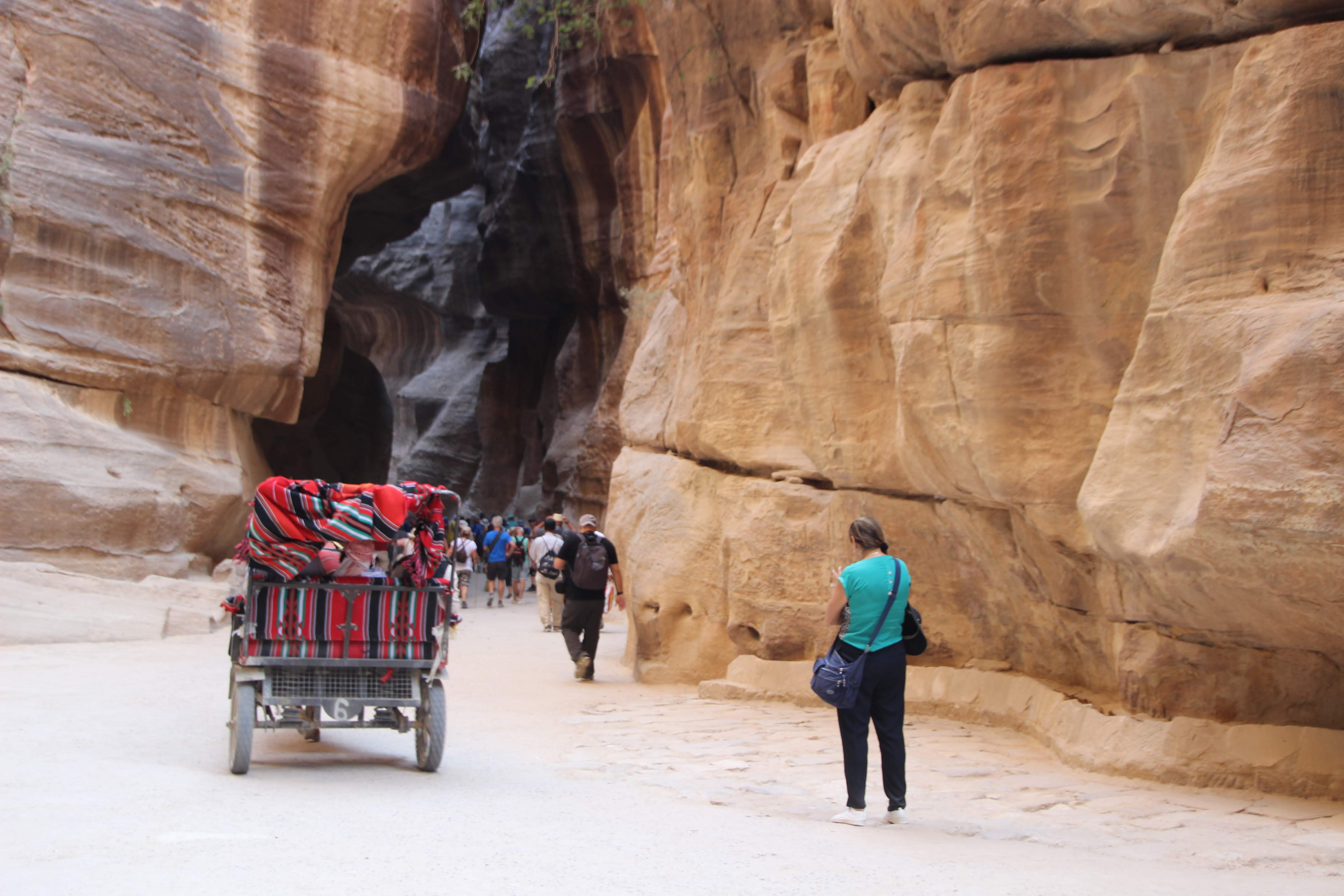 Walking through the Siq gorge, we had to keep our ears listening for horses, donkeys or carriages that would come down the path. The carriages come through quite fast, and tend to have bells on them to give some warning. The Bedouin people are all along the trail, men and children, trying to make eye contact, trying to sell something to you. This is their living. This is their means of survival in a harsh countryside.