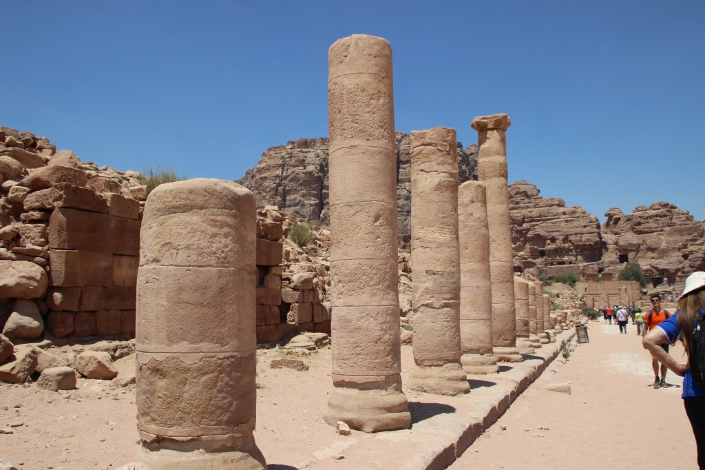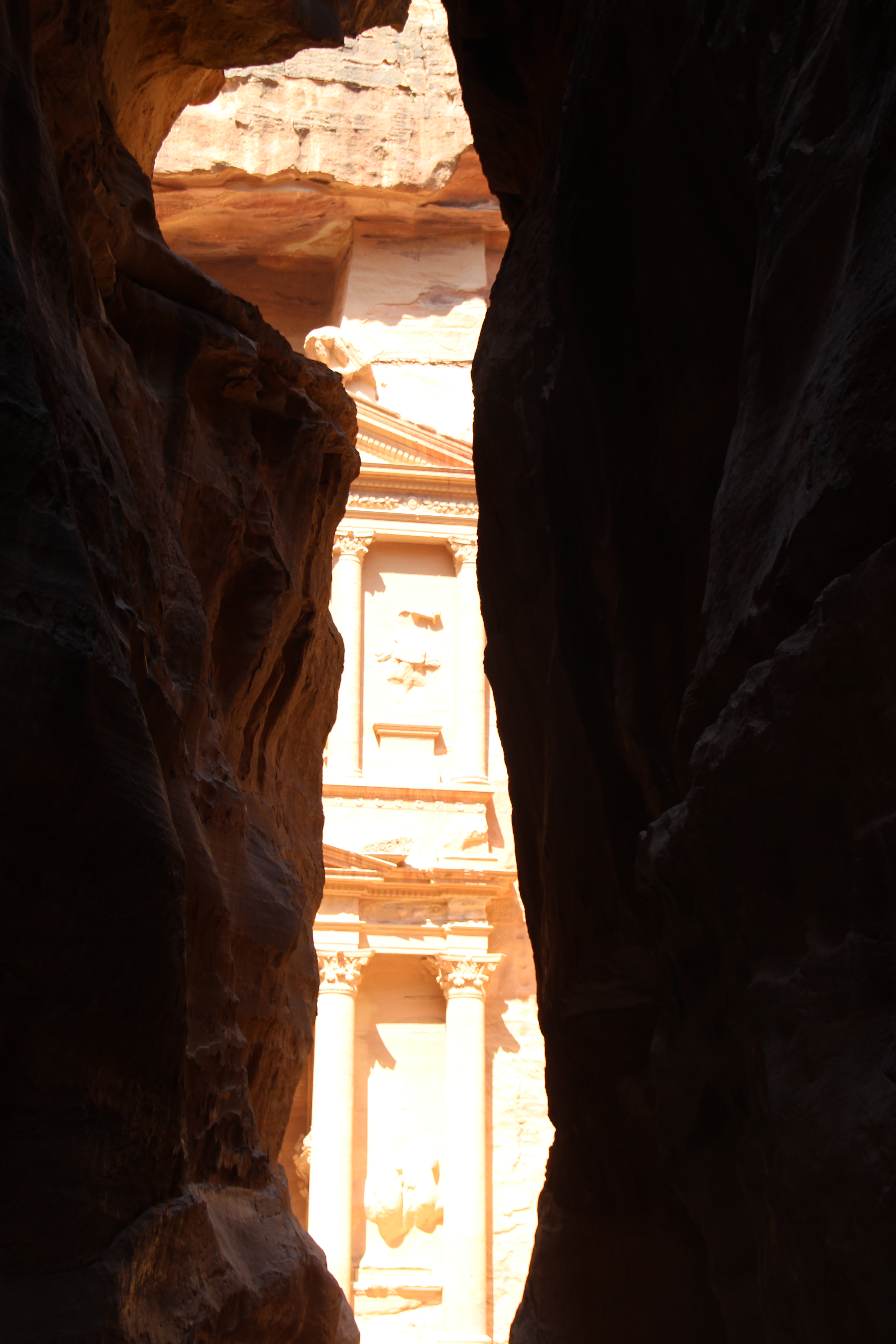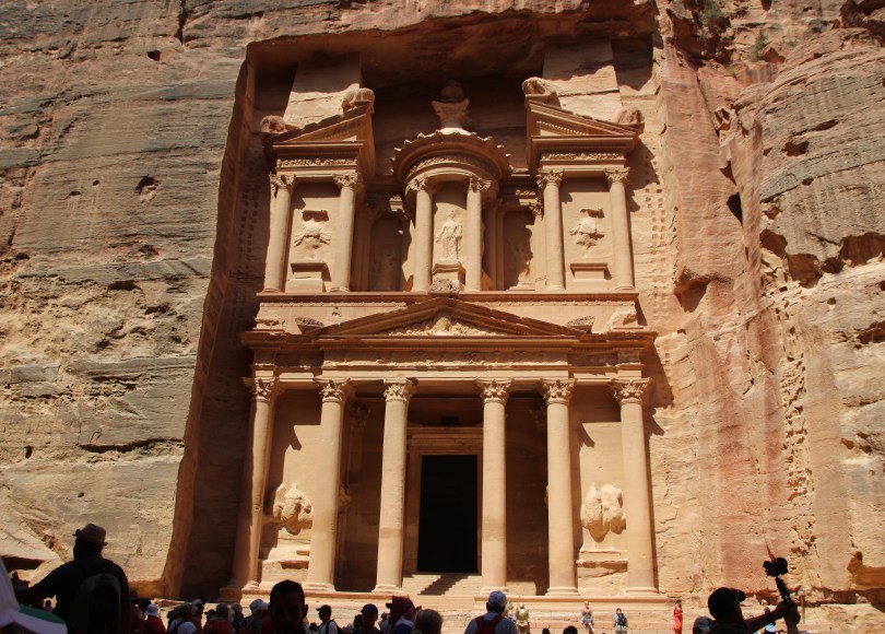 Nothing will top off seeing the first peek of the Treasury. The rocks pull away, and in the crack of the gorge in front of you, you see the fabulous pillars emerge. This place is traditionally called “Al-Khazneh”. It was a city of the “Nabatean Kingdom” (established 3rd C BC, and conquered by the Romans in 106AD), inhabited by the Arabs in ancient times. This elaborate temple was carved out of the sandstone rock, originally to serve as a crypt. Such a beautiful place, with camels, donkeys and horses waiting for passengers, Bedouin men, women and children with jewellery and postcards hoping for a buyer, and this awe inspiring temple frontage right in front of us.