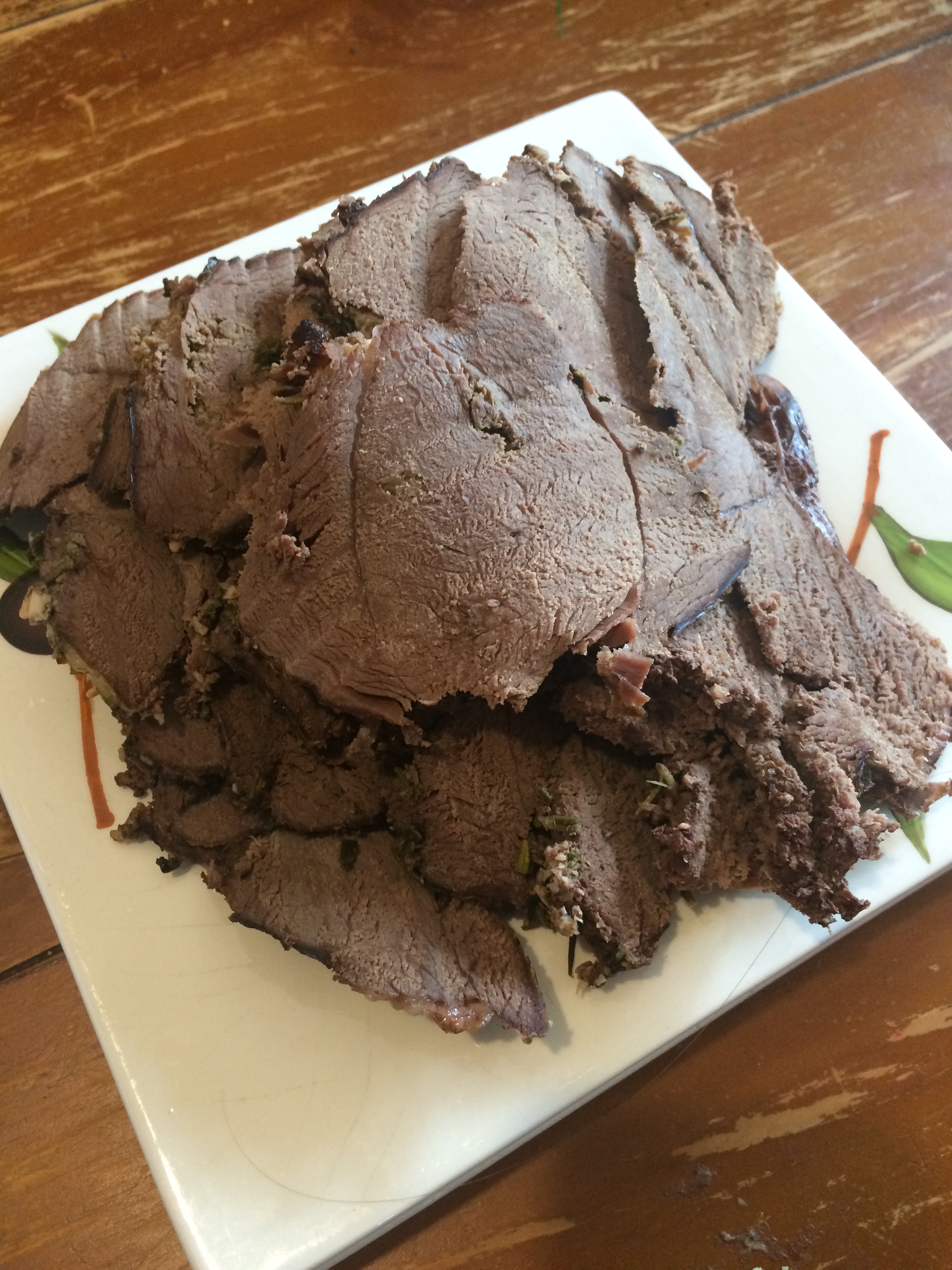 So I prepared it by coating it in flour, a good drizzle of our own olive oil and plenty of salt and pepper. Now Usually I would sear meat first, and I probably should have put it in my hot cast iron frypan to sear each side, to lock in the juices…but I kinda forgot. I got to excited getting the rosemary and garlic together. So I figured if I was slow roasting this like a leg of lamb, I would season it the same way. So I made some slashed in the flesh with a knife, and poked in some rosemary from the garden (freshly washed by the rain), and some garlic cloves.