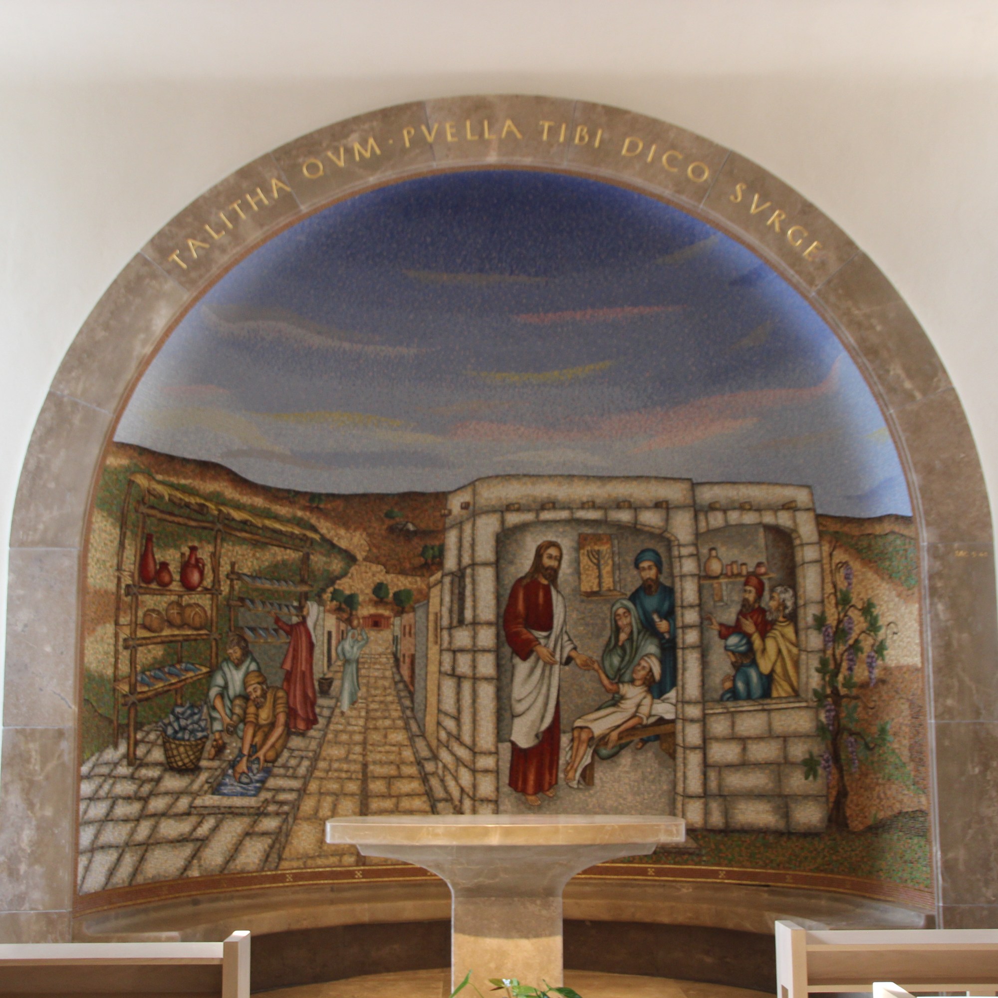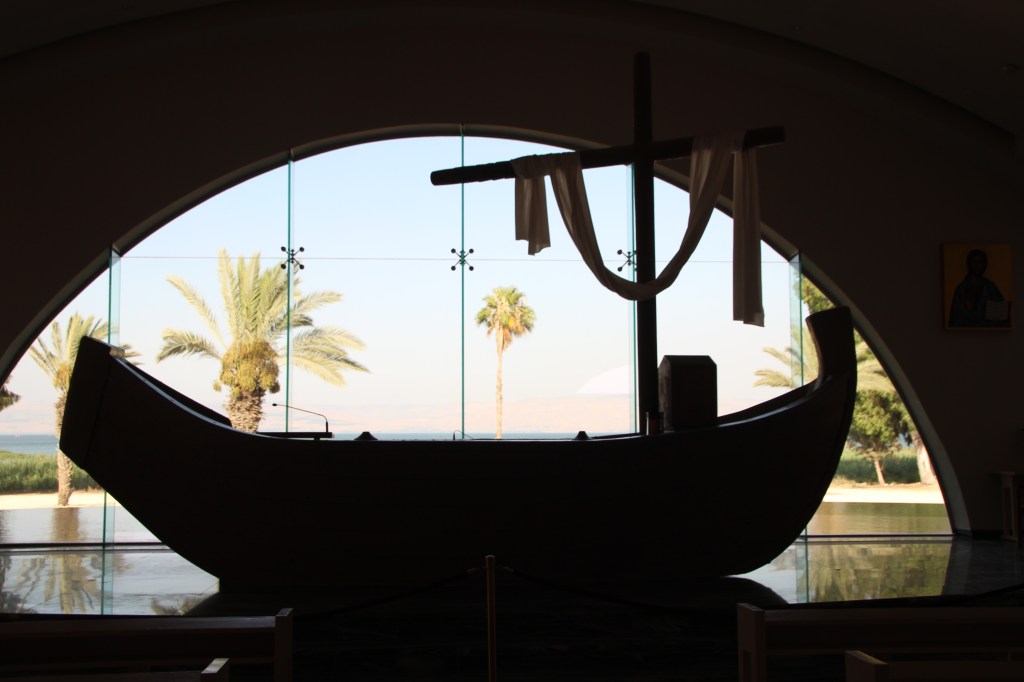 Also near the atrium is an alter with a huge fishing boat, with a window behind it overlooking the Sea of Galilee. A beautiful symbol, which summarises a lot of Jesus’ ministry while around these shores. There is a lot of art work in these little side rooms, depicting the Bible stories, especially the disciples.