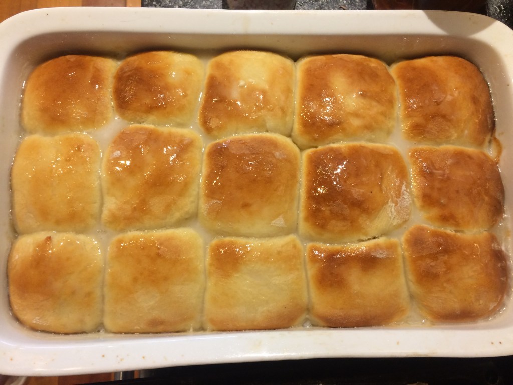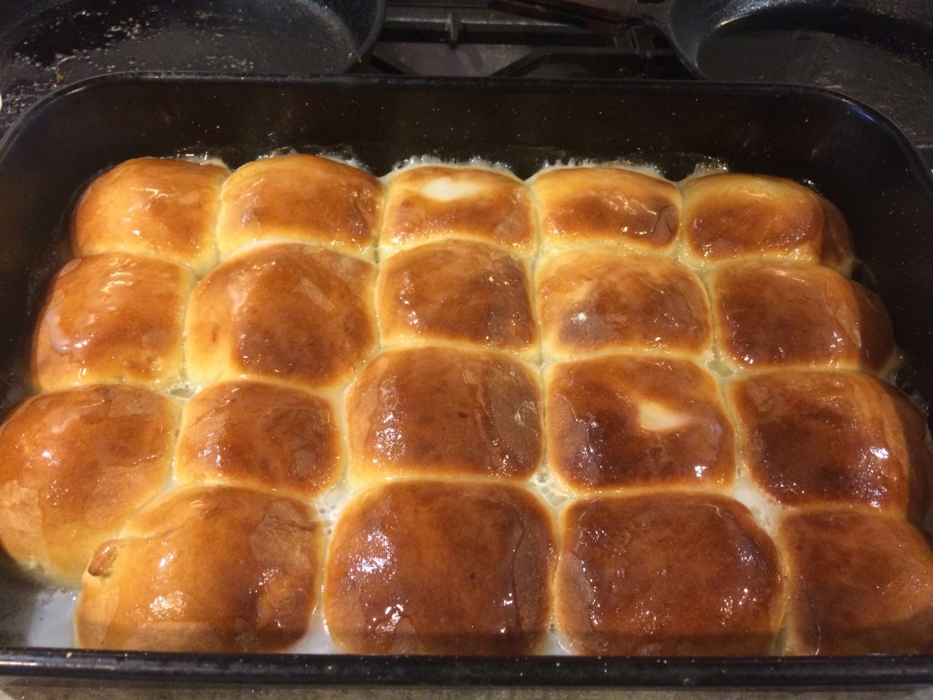 Place rolls in a pan or cookie sheet and raise again for about 15 to 20 minutes. They shouldn’t be touching before raising, but should be after raising. One tip I do…I put the oven onto 50 degrees, wait 10 mins for the oven to heat up, and then switch it off. Place the trays of rolls into the oven with the door shut until doubled in size.