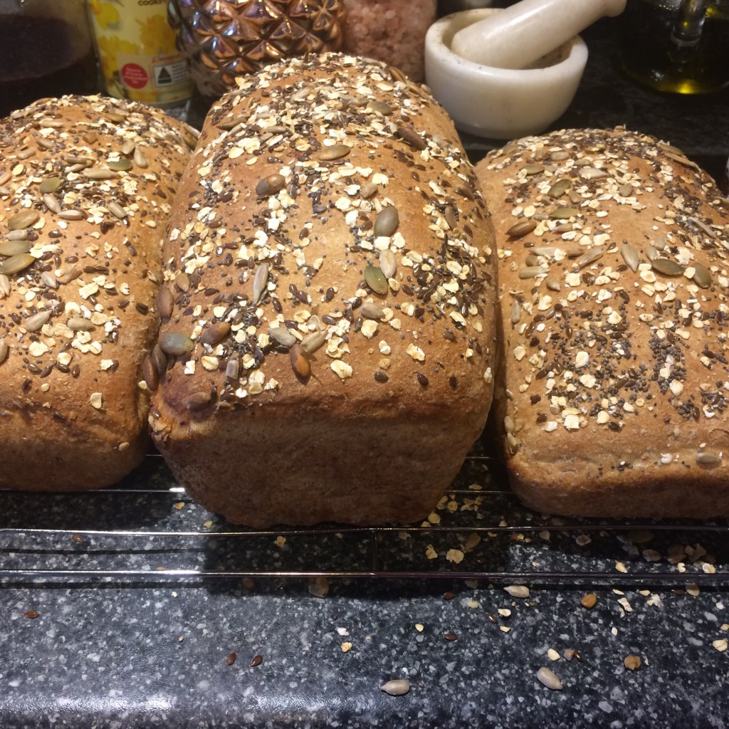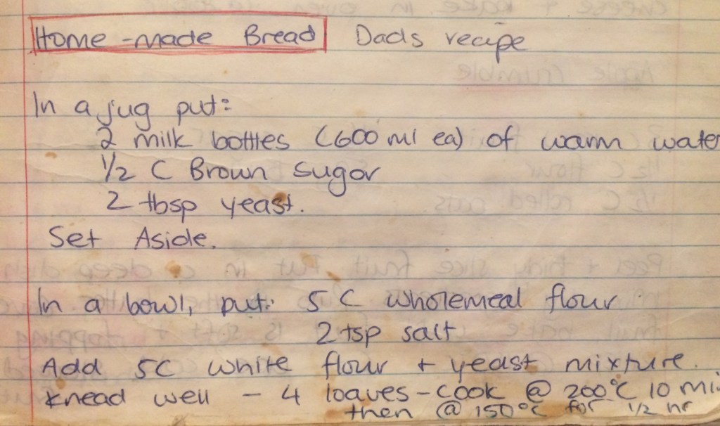 The kids were desperate for more of “Poppa’s bread”, (his loaf only lasted a day) so I dug out his recipe and today we made a half recipe of Poppa’s proper bread. Not bread-maker bread, not rushed break that is hard like a rock, but proper bread that takes time, good thoughts and care. I love how the recipe used a very precise measurement of 2 milk bottles – the old glass ones that were delivered to the door in exchange of little tokens.