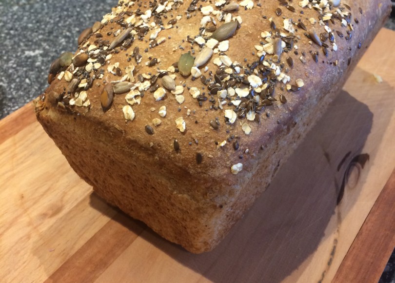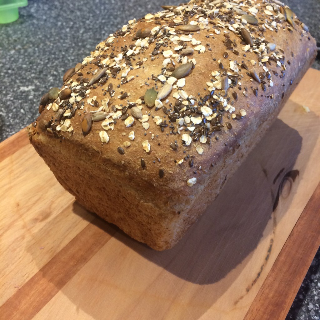 Alex helped me, and we chatted about memories when the kids would go to mum and dad’s on a Monday (staff meeting day), and dad would make bread with eager little helpers. Alex remembers eating the dough off the spoon…ewww. We took turns kneading, and left the bread to rise in a slightly warmed oven (heat up the oven to a low temperature like 30 degrees, then turn off, and put dough in the oven, in the bowl). The dough rose beautifully and we patiently waited as long as we could for the loaf to cool before having it for dinner. It was still pretty steamy, but delicious and very satisfying!
