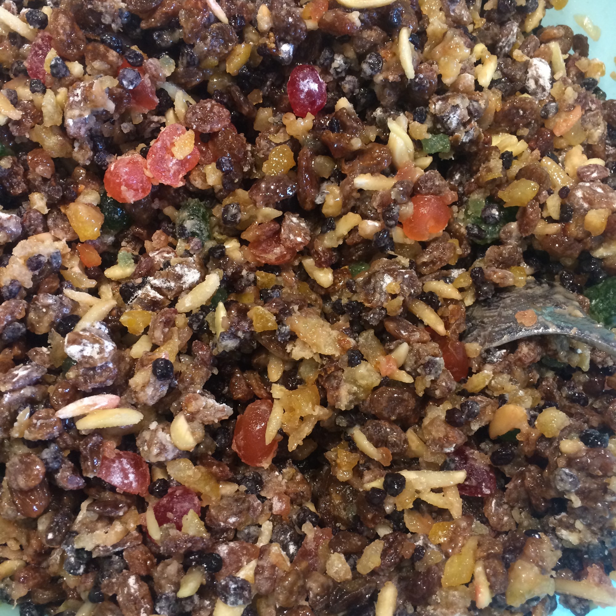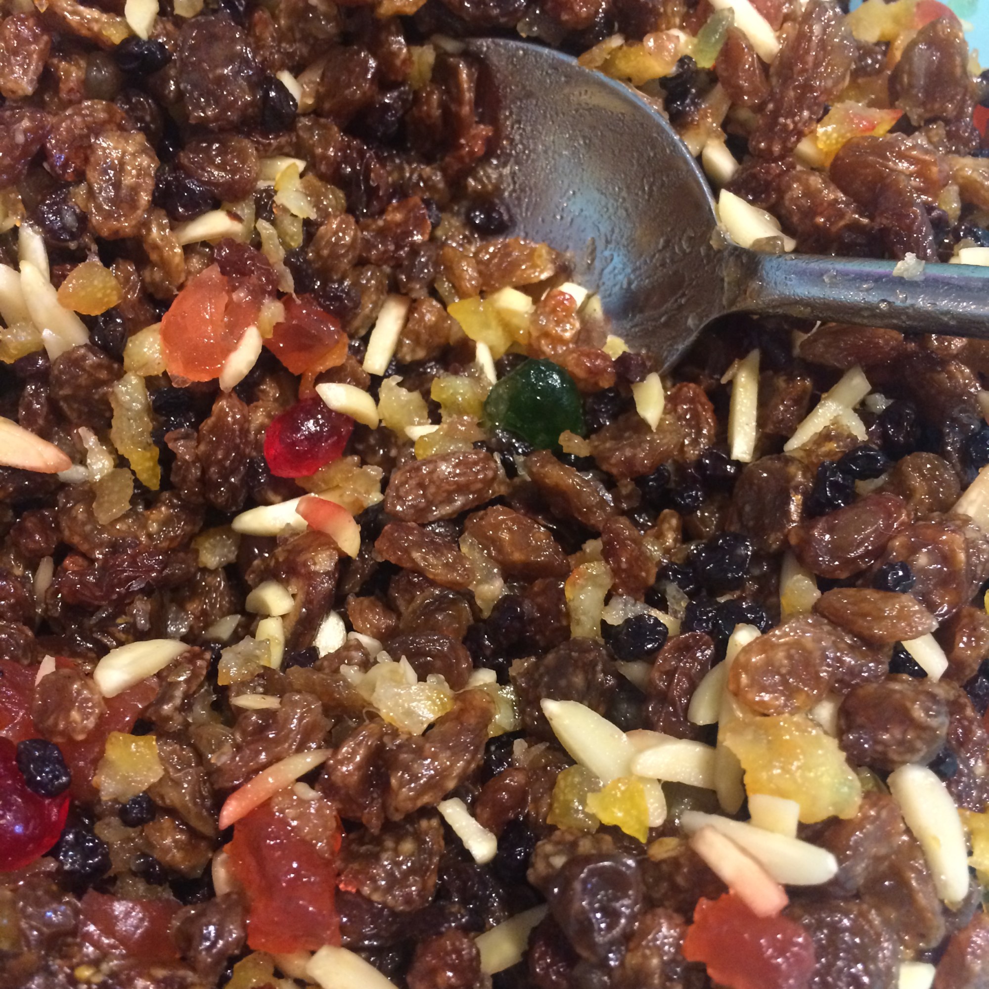 To make up 5-6lb fruit, use mixed fruit (2kg), glace cherries, glace peel, slivered almonds (I love nuts in my cakes), currants (we like currants), and chopped dates/prunes to make up the weight. Soak in brandy or grape juice (for a non-alcoholic alternative) for a couple of days, stirring a couple of times a day.