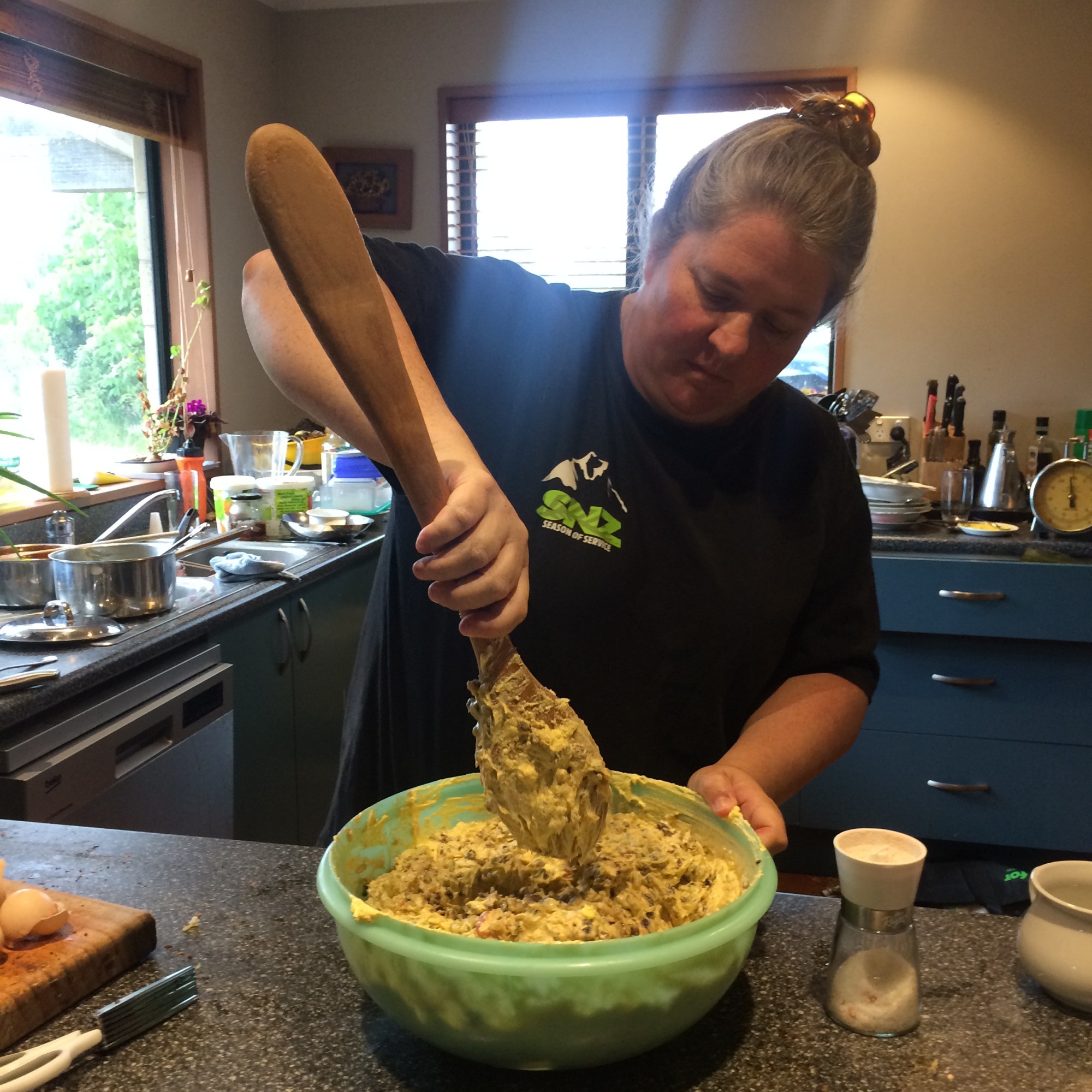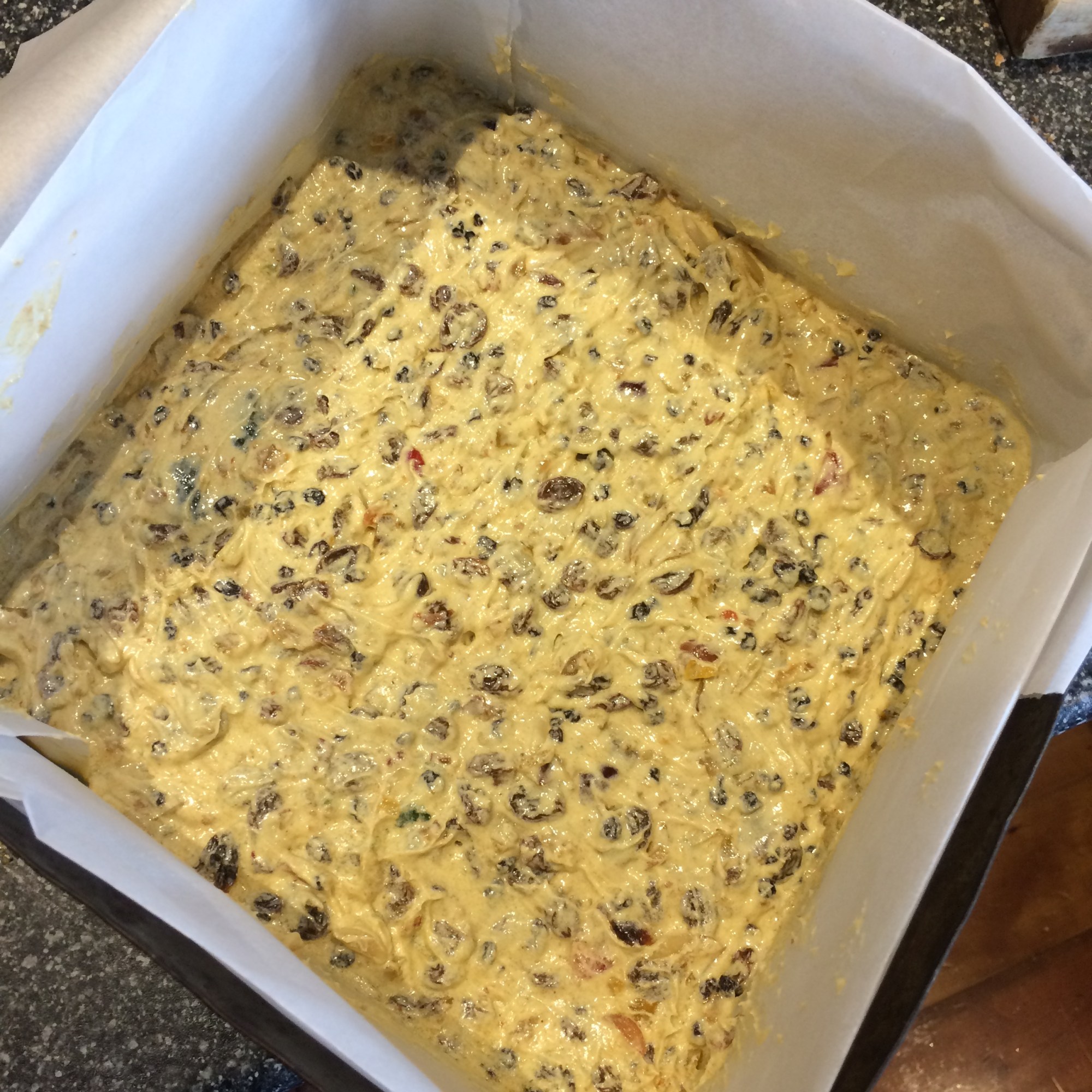 Get the traditional family spoon, and have everyone take turns stirring the egg mixture into the fruit mixture. Line a tin well (I add the butter paper at the bottom on top of baking paper – family tradition to use it, so I still find myself doing it!). Bake for a few hours at 100-125 deg C – at least 4 hours. In the end, for this years’ cake I had the oven somewhere between 100 and 125, and it was cooked for 5 hours. However I need to experiment with 100 deg C as well, that might make a more solid cake.