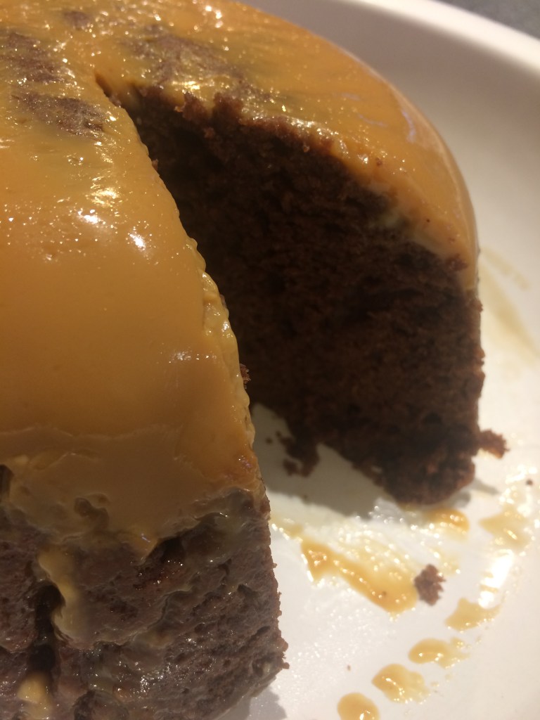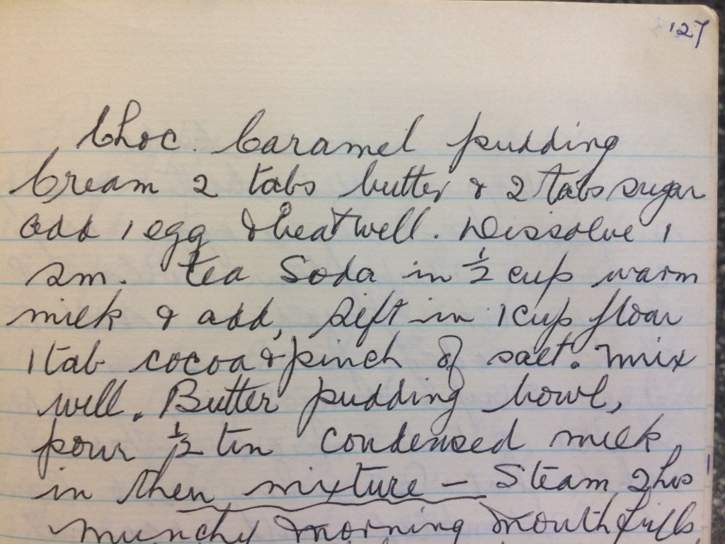 Cream 2 tabs butter and 2 tabs sugar. Add 1 egg and beat well. Dissolve 1 small tea(spoon) Soda in 1/2 cup warm milk and add. Sift in 1 Cup flour, 1 tab cocoa and a pinch of salt. Mix well. Butter pudding bowl, pour 1/2 tin condensed milk in then mixture. Steam 2 hours.