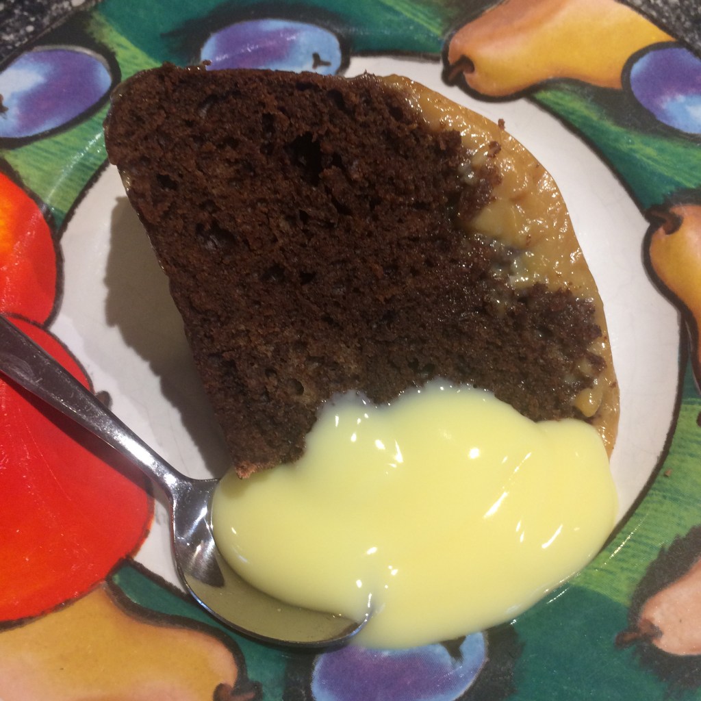 It turned out very nice, but here are some variations to this recipe. First I made a double recipe, for serving 5 people, with about 1/4 of the pudding left over once eldest son had finished! Next time I would probably cook it for 1 1/2 hours rather than 2. Even though I doubled the recipe, I only put in half a tin of condensed milk in the basin…mistake. Next time a whole tin would be perfect! It was the best bit…caramelised condensed milk! I also thought it would be nice with chocolate chips throughout the pudding. It was perfect served with custard, although I was wishing I had some raspberries on hand to accompany it!