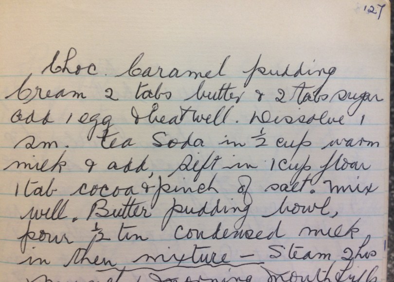 Cream 2 tabs butter and 2 tabs sugar. Add 1 egg and beat well. Dissolve 1 small tea(spoon) Soda in 1/2 cup warm milk and add. Sift in 1 Cup flour, 1 tab cocoa and a pinch of salt. Mix well. Butter pudding bowl, pour 1/2 tin condensed milk in then mixture. Steam 2 hours.